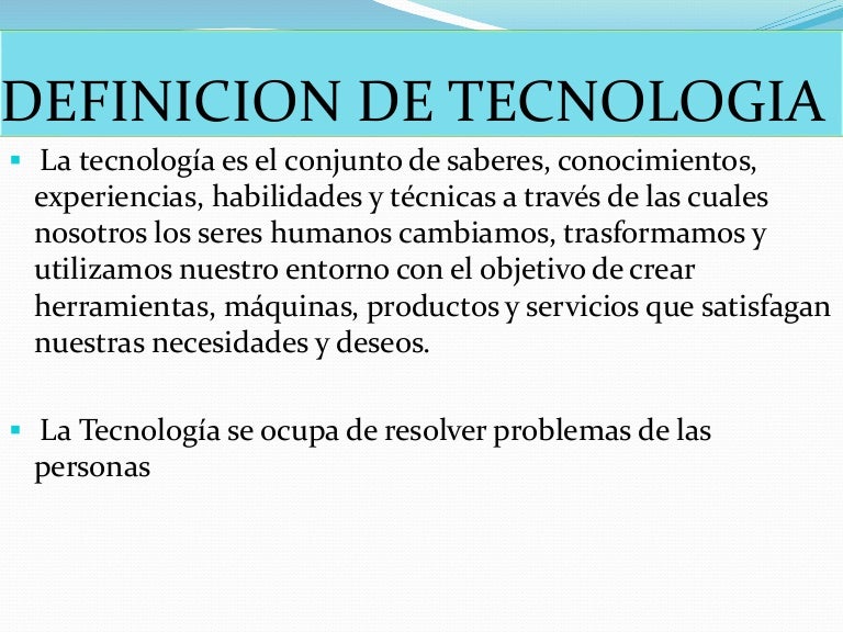 La tecnología es el conjunto de saberes, conocimientos, experiencias, habilidades y técnicas a través de las cuales nosotros los seres humanos cambiamos, trasformamos y utilizamos nuestro entorno con el objetivo.
